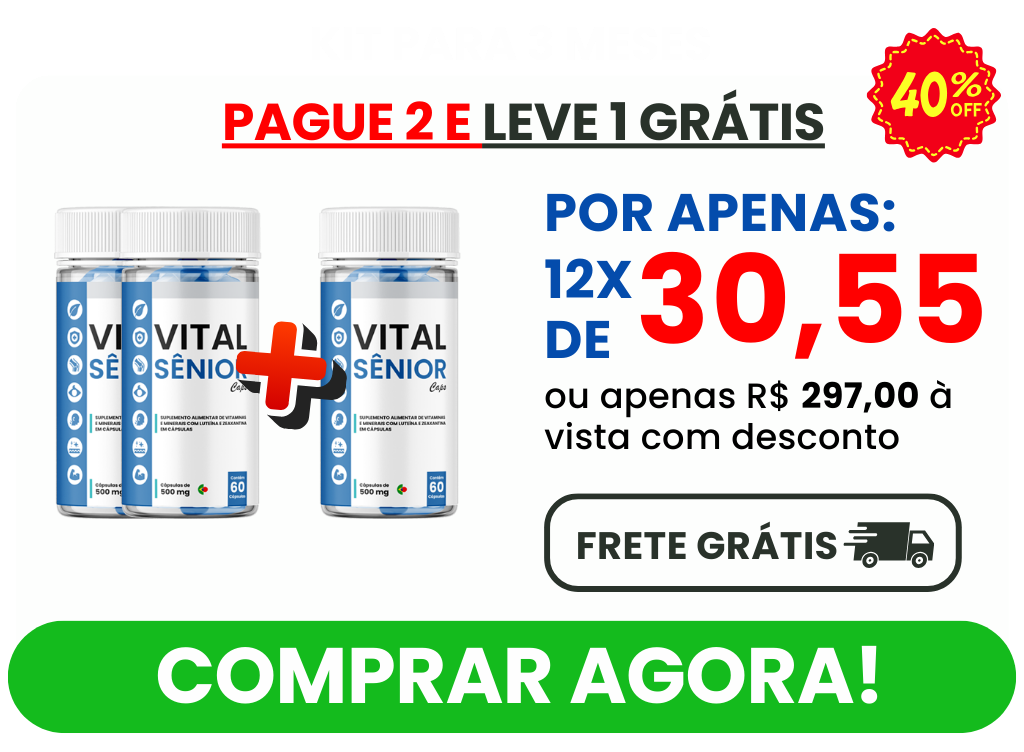 Vital Sênior é uma poderosa combinação de 23 ingredientes naturais, incluindo vitaminas e minerais essenciais como Vitamina A, Vitamina C, Vitamina E, Vitamina D3, Vitamina B1, Vitamina B2, Niacina, Ácido Pantotênico, Vitamina B6, Ácido Fólico, Biotina, Vitamina B12, Vitamina K2, Ferro, Zinco, Iodo, Cromo, Selênio, Molibdênio, Manganês, Magnésio, Luteína e Zeaxantina! É a fórmula mais completa e eficaz do Brasil, capaz de aliviar doze tipos de dores diferentes e devolver sua qualidade de vida!